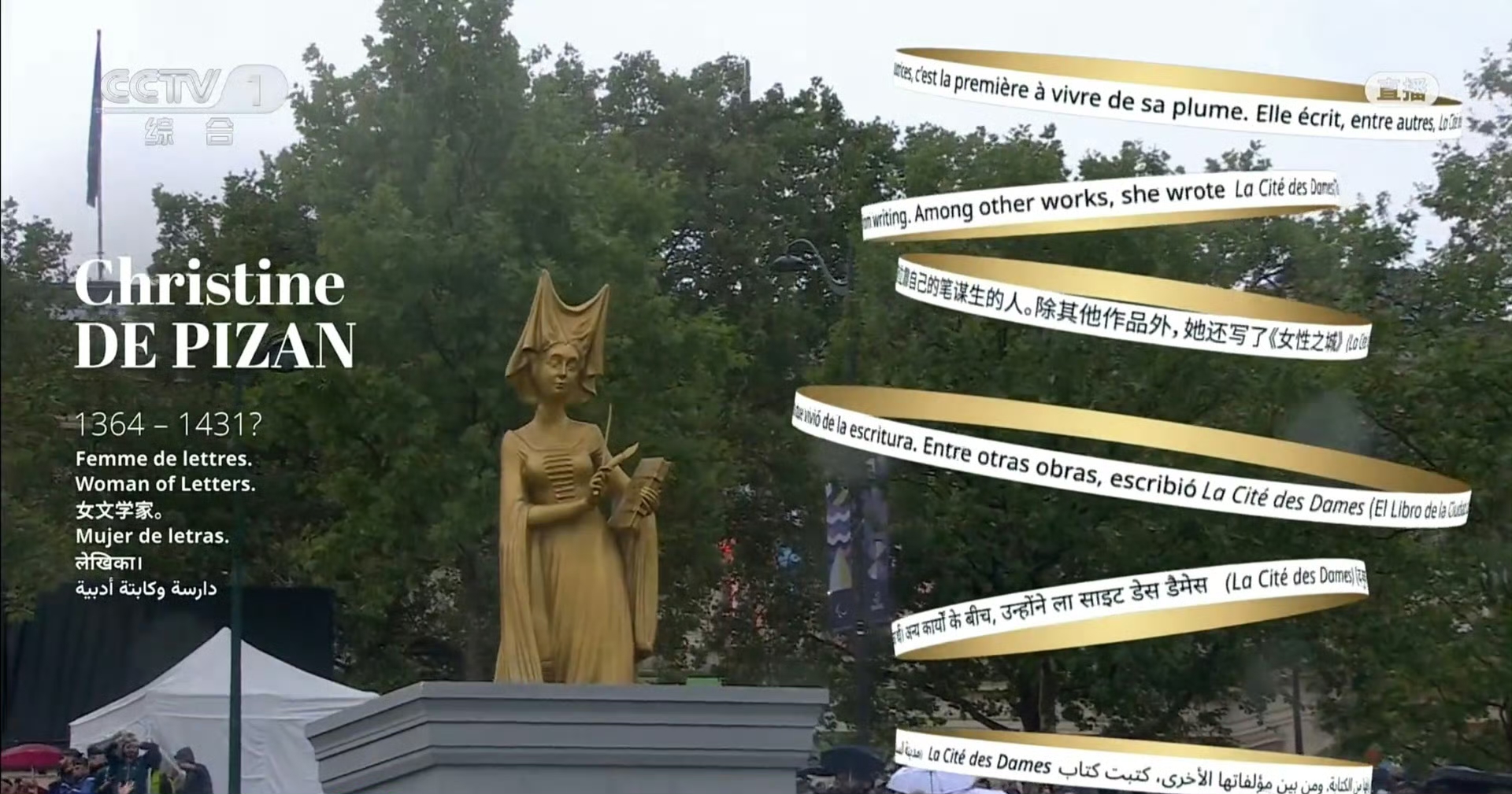 林子人:雕像中其实有一些很有趣的人。我之前读《文艺复兴人》,里面介绍了各种各样文艺复兴时期有趣的人物,也提到了开幕式雕像之一的克里斯蒂娜·德·皮桑。书中介绍说她是一个文艺复兴时期的女文学家。皮桑出生于威尼斯,十五岁就结婚了。她和丈夫感情很好,但丈夫很年轻就突然离世了。变成寡妇的皮桑一度穷困潦倒,不得不去法庭打官司要回丈夫的遗产。为了生存,她开始以写作为生,一生写了非常多的作品,可以说她是法国历史上甚至是欧洲历史上第一位以职业写作为生的女性。