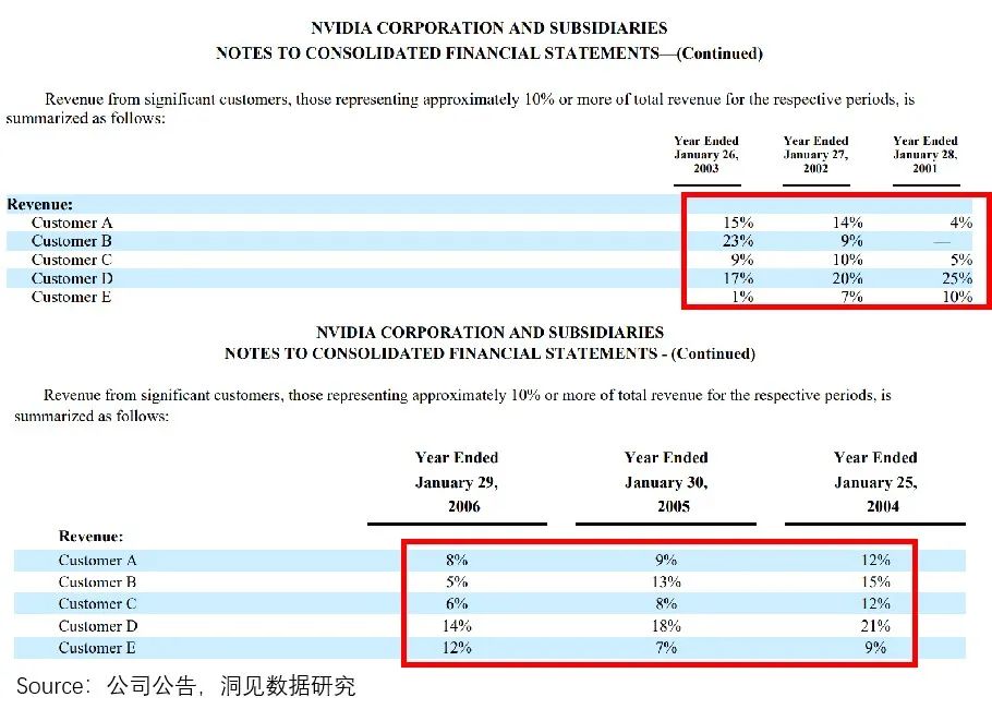 如下图,2004-2006年英伟达的营收持续增长,而其前五大客户贡献的收入占比却持续下降。
