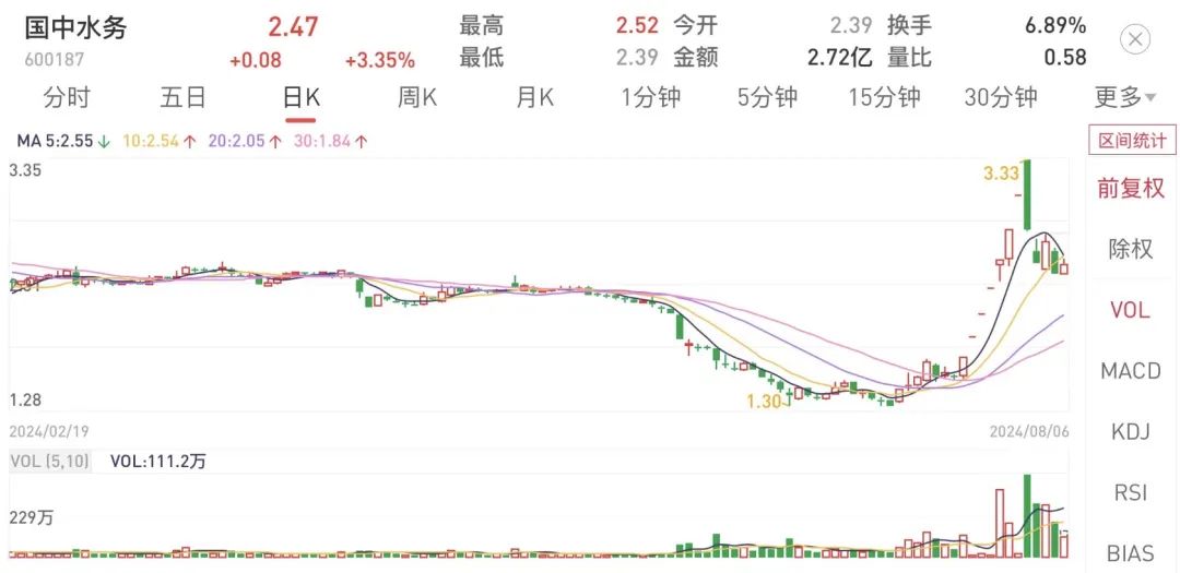 资本市场对此作出了积极的回应,消息发布的一周内,国中水务的股价一度迎来7连涨,从7月22日的1.55元/股涨至3.04元/股,累计涨幅高达96.13%。