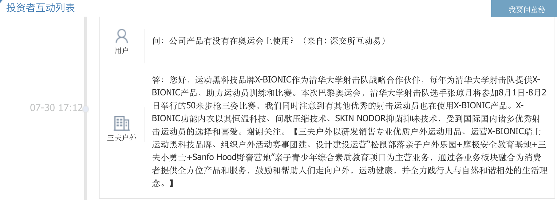 “公司和清华大学射击队有合作”,三夫户外公司工作人员表示,运动黑科技品牌X-BIONIC作为清华大学射击队战略合作伙伴,本次巴黎奥运会,清华大学射击队选手张琼月参加了50米步枪三姿比赛,获得了铜牌。