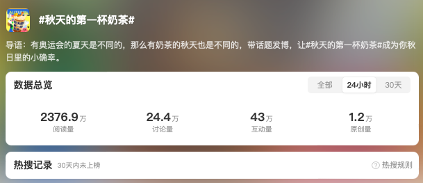 比如微博,#秋天第一杯奶茶#在8月7日仅有2000多万的阅读量,虽然累计4年的话题超过45亿(很多媒体都写错了这一点!!!)