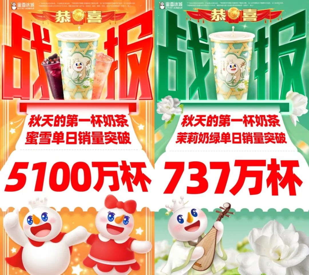 比如蜜雪冰城,门店主打——茉莉奶绿,售价只有6元,在门店现场唱《好一朵美丽的茉莉花》再减一元,单日销量突破737万杯!