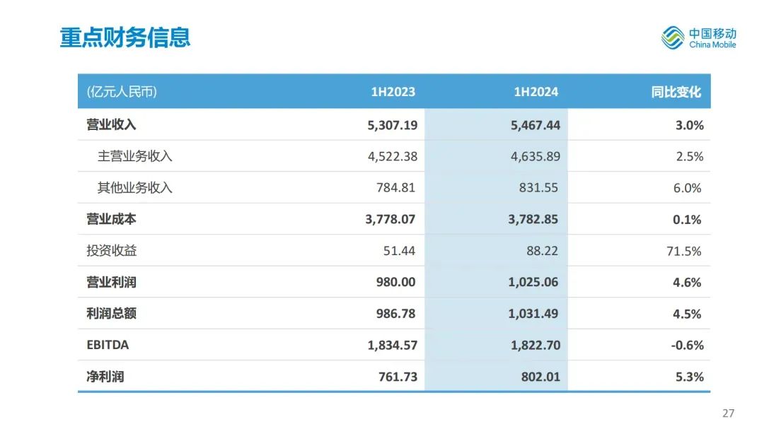 8月8日晚间,中国移动披露2024年半年度报告。公告显示,今年上半年,中国移动营业收入达到5467亿元,同比增长3.0%,其中,主营业务收入达到4636亿元,同比增长2.5%。