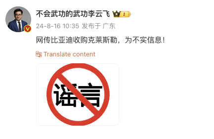 8月16日,有消息称,比亚迪正推进收购克莱斯勒。比亚迪集团品牌与公关事业部总经理李云飞回应称“不实消息”。