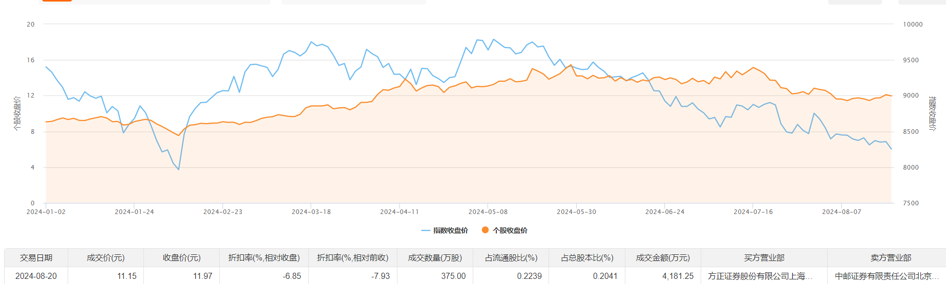 兴业银锡8月20日大宗交易成交375万股,成交额4181.25万元,占当日总成交额的16.14%,成交价11.15元,较市场收盘价11.97元折价6.85%。