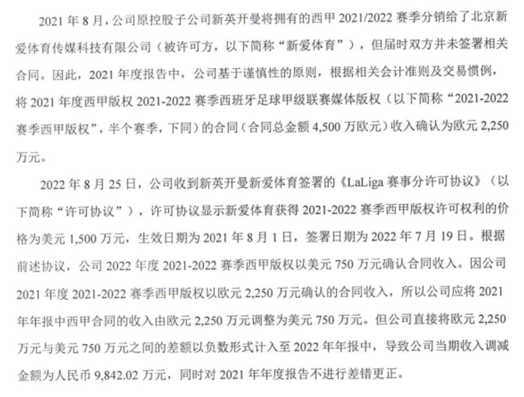 但到2022年8月,当代明诚收到了双方签订的协议,协议显示授权金额仅为1500万美元。按照这一协议,当代明诚2021年度西甲版权收入应调整为750万美元。
