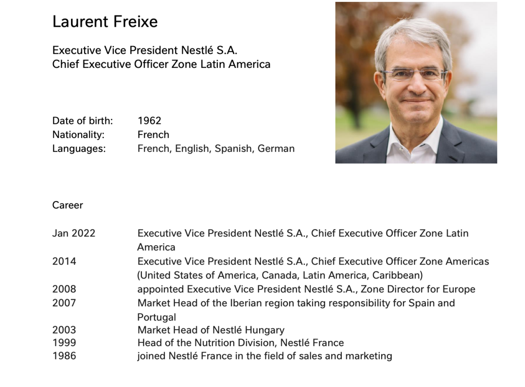 今天,雀巢集团在一份通报中说,本身是法国人的Laurent Freixe于1986年加入雀巢法国分公司。此后,他在公司内不断晋升,在不同业务、市场和区域担任过各种职位,职责越来越大。