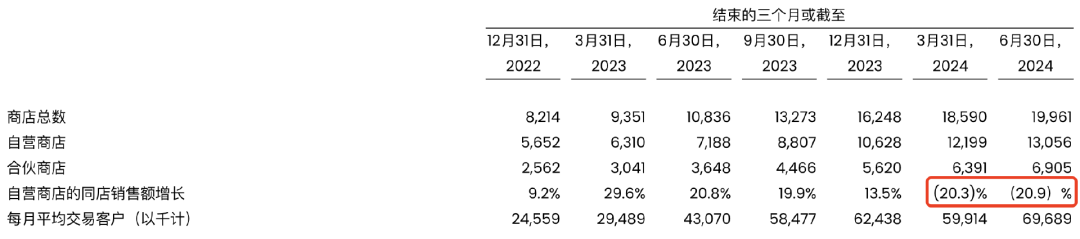 通常来说,门店规模翻倍,理想情况下,销量和用户应该线性增长,可瑞幸的门店销售和用户转化率不增反降。其中自营商店的同店销售额(已经开业一定时间以上的门店的销售额)在今年上半年连续两个季度出现负增长,分别下降20.3%和20.9%。月平均交易客户数今年Q1出现环比负增长,Q2的同比增速仅有62%,为2023年以来的同比增速最低点。