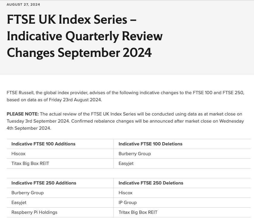 全球指数提供商富时罗素(FTSE Russell)当地时间8月27日根据截至2024年8月23日的数据,就富时100指数和富时250指数的以下指示性变动发出通知: