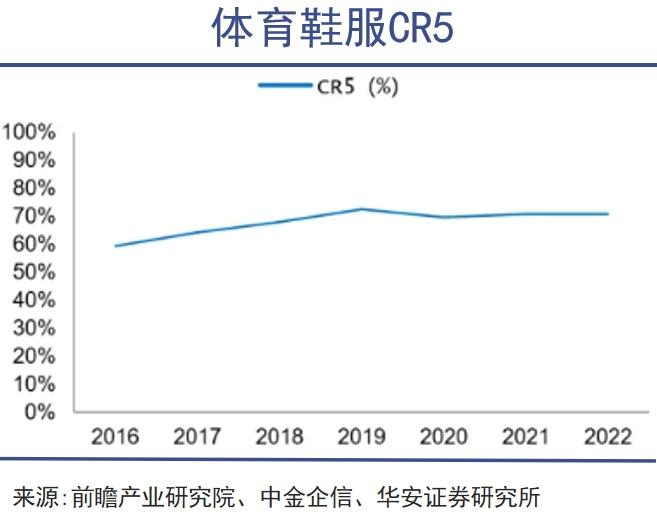 长期以来,体育品牌的竞争格局都较为稳定,尽管行业内不断有竞争对手冒头,但市场仍然维持双超、多强的局面。2022年体育鞋服CR5接近70%,远高于传统鞋服行业10.4%的水平,其中光是耐克、安踏两家公司市占率就达到了50%。