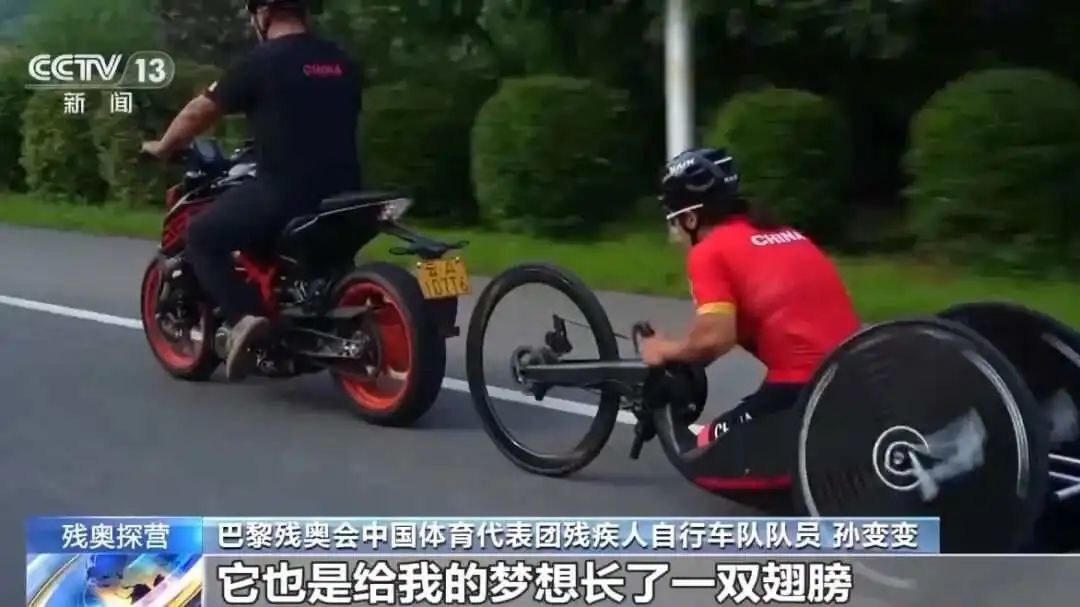 孙变变的参赛项目是手摇自行车。训练过程中,她需要在自行车上保持跪姿,通过双手摇动摇杆的方式启动,极大限度地考验了体能和核心及平衡能力。