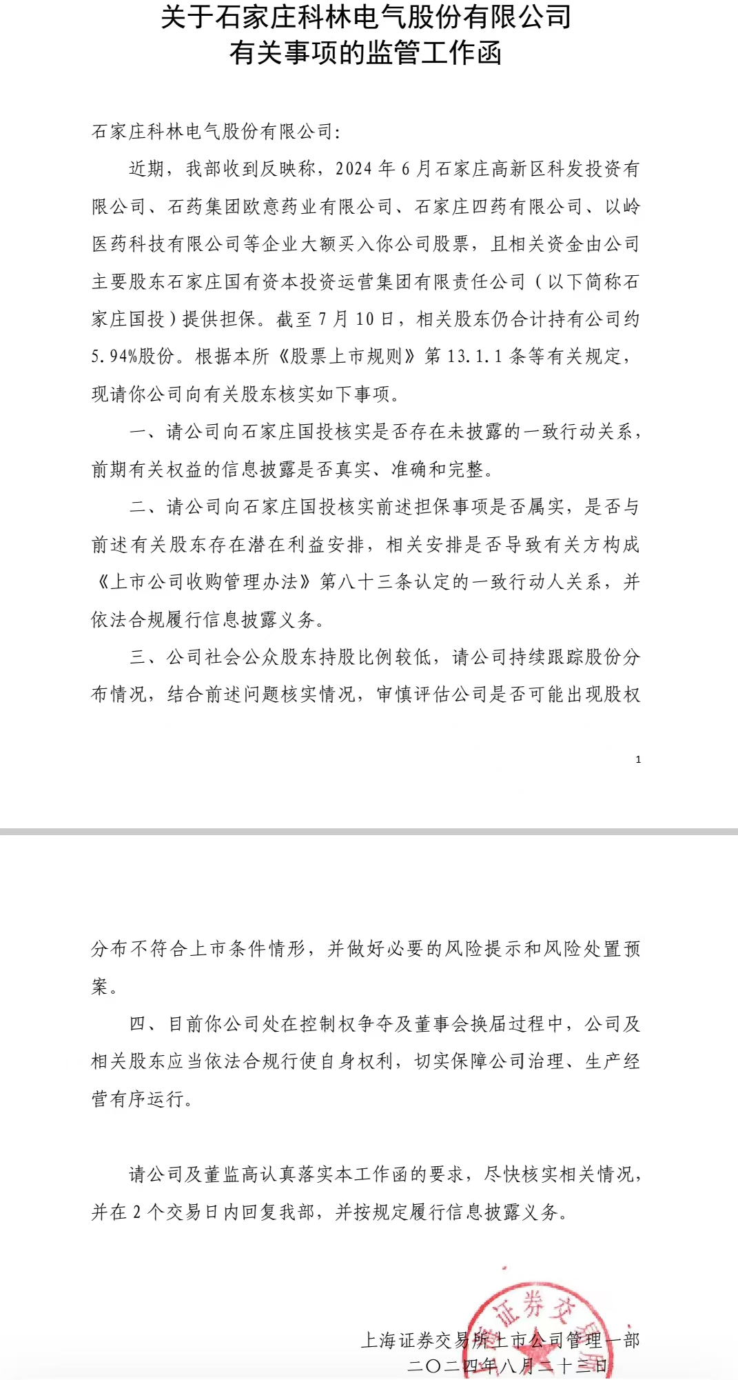 监管函据此要求科林电气和石家庄国投说明缘由,直指后者的增持行为“程序违规”。