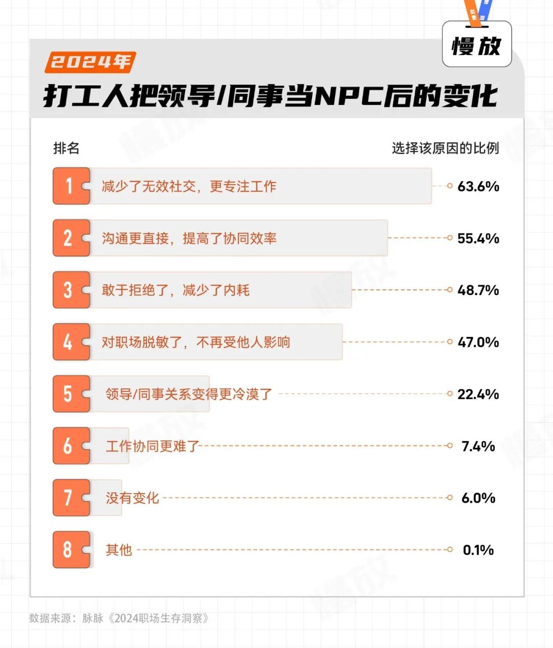 面对职场内耗,职场人开始学着将领导、同事视为NPC,告诉自己别放大情绪,别为难自己,人生不过三万天,健康快乐最值钱。脉脉调查显示,当职场人把领导/同事当作NPC后,发现工作单纯了很多。63.6%的人认为这样做较少了无效社交,更专注工作,55.4%的人认为工作沟通更直接了,反而提升了协同效率。