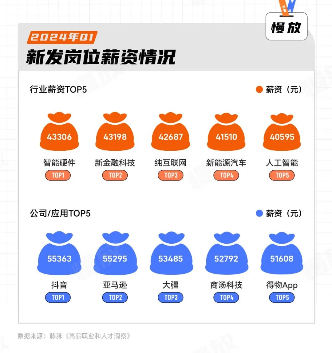 脉脉2024年Q1《高薪职业和人才洞察》报告显示,智能硬件、新金融科技超越了纯互联网行业,成为了新的高薪行业,月薪超过4.3万;而在新发岗位平均薪资最高的20个公司中,抖音以55363元位居高薪榜第 ,其次是亚马逊55295元,大疆53485元位列第三。我们可以看到,随着中国智造的崛起,以及AI的发展,一大批高薪岗位在持续涌现。