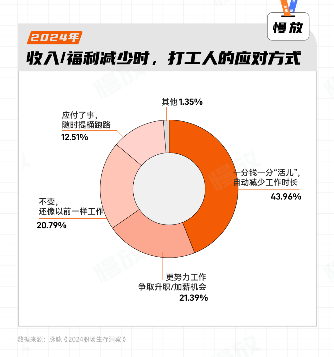 当面对逐渐性价比失衡的职场,打工人也有自己主动调节的策略。脉脉《2024职场生存洞察》显示,如果收入或福利减少,那么43.96%的人选择一分钱一分“活儿”,自动减少工作时长。他们或是在厕所、便利店摸鱼20分钟,或是利用在线文档和好友玩起了飞花令,以提升时薪。
