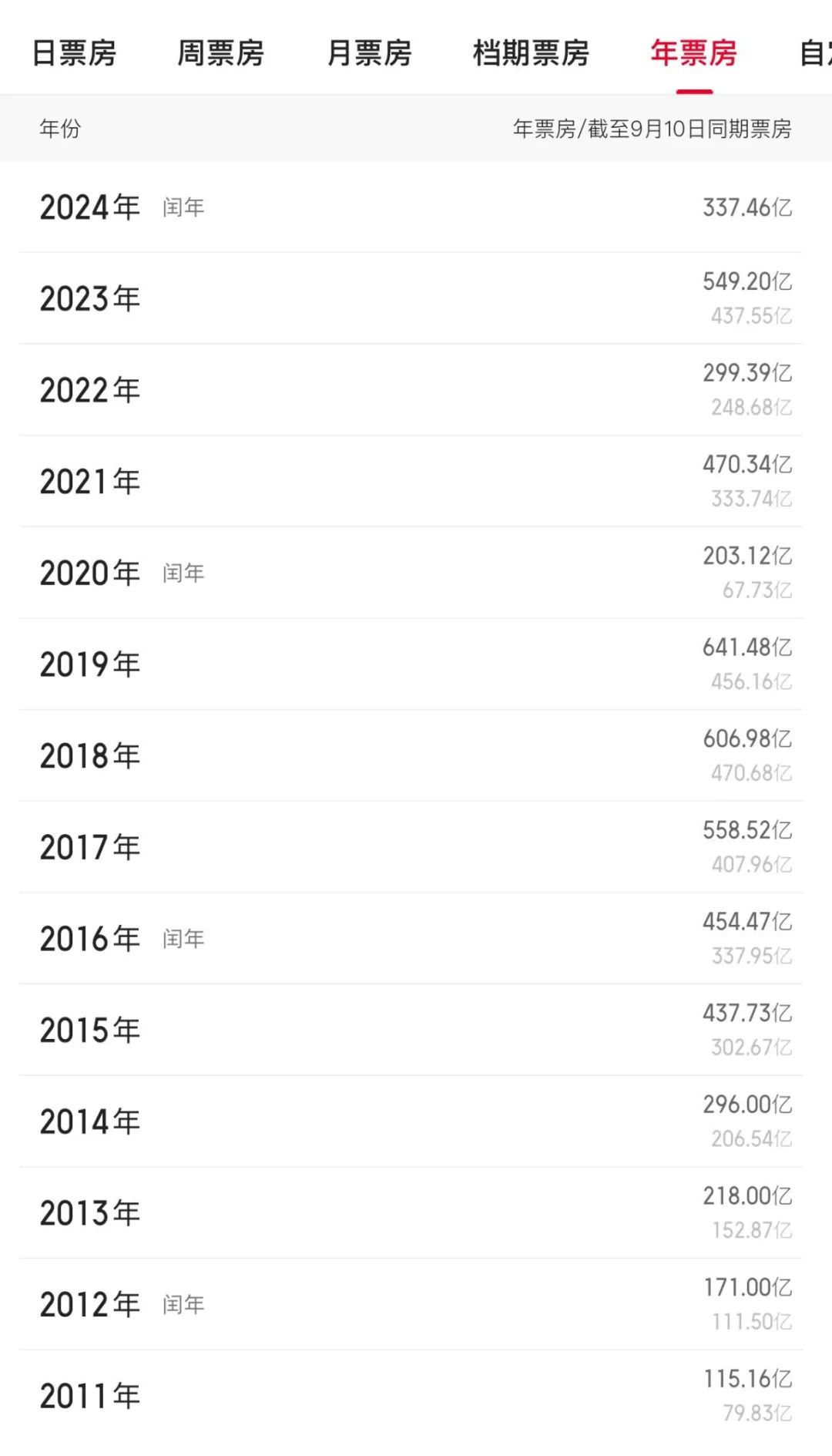 暑期档一朝回到十年前,整个电影市场的年度票房压力也随之陡增。据猫眼专业版数据显示,截止发稿前,2024年电影市场总票房不足340亿,较2023年存在超210亿之差,较疫情前的2019年更有超300亿的追赶距离。