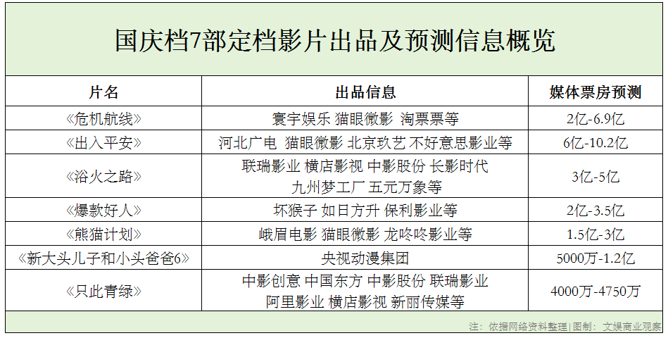 截止发稿前,今年的国庆档共计已有7部影片定档,包括高空犯罪题材电影《危机航线》、灾难现实电影《出入平安》、打拐犯罪题材电影《浴火之路》、喜剧电影《爆款好人》、舞蹈诗剧《只此青绿》以及陪伴了三代人成长的经典动画系列第六部《新大头儿子和小头爸爸6:迷你大冒险》。