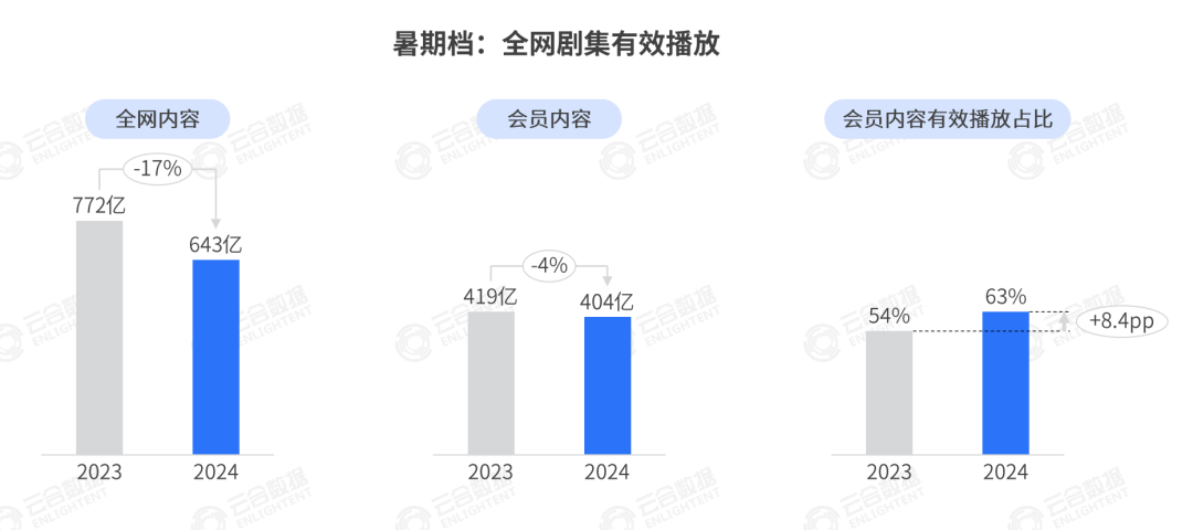 在这背后,其实能够看出平台的内容打法有所调整。比起押注不确定性更强的大爆内容,视频平台更稳妥的打法是做好垂类和腰部内容。尤其是在各平台会员机制愈发成熟的当下,激活付费用户的活跃度变得更加重要。从结果看,各平台也在今年暑期档交出不错的答卷,云合数据显示,在档期剧集有效播放量同比下滑的前提下,全网剧集会员内容的有效播放占比从去年的54%上涨至63%,会员活跃度对内容市场的影响还在进一步加深。