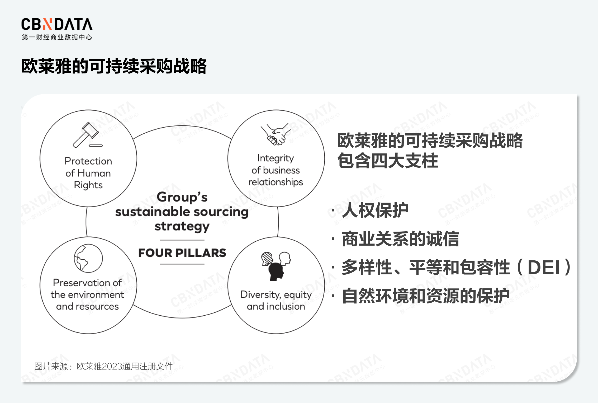 以欧莱雅集团为例,其在2023年全球注册文件中指出集团的可持续采购战略包含四大支柱:人权保护;商业关系的诚信;多样性、平等和包容性(DEI);自然环境和资源的保护。