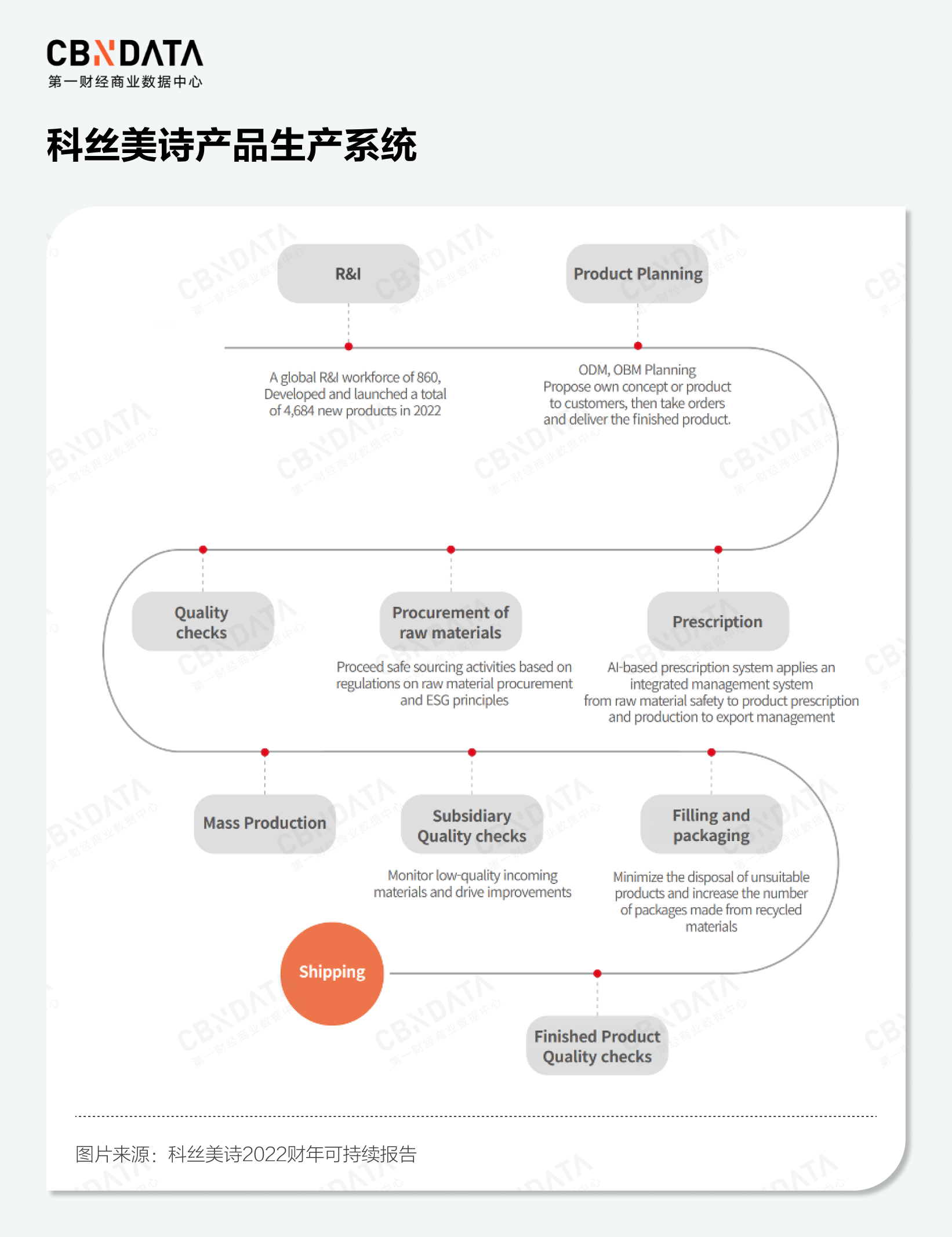那么谁来编排?以美妆代工企业科丝美诗的产品生产系统为例,可以看到一件美妆产品在抵达流通渠道之前,主要经历了研发- 产品计划 - 配方管理系统 - 原材料采购 - 质量检测 - 大批量生产 - 子工厂质量监测 - 灌装和包装 - 最终质量检测 - 运输十大关键步骤,其中R&I(研发)、产品计划和配方管理系统直接影响到后续的采购环节。可以说,企业“要投入多少资源做出这样的产品”(资金)“要做多少这样的产品”(数量)“用什么样的原材料制作这些产品”(性能功效),这些决定采购参数的关键决策,主要由这些部门决定。