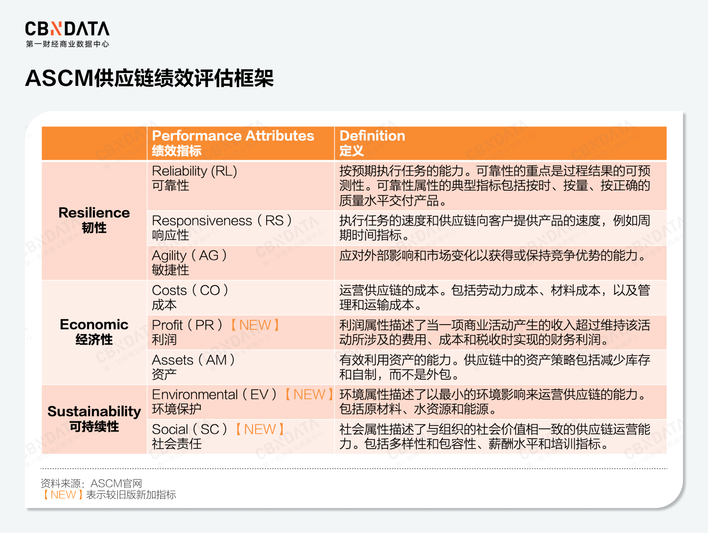 ASCM在最新的供应链绩效评估框架中提出了三大维度和八大指标。不难发现,这些绩效指标与这四大要素紧密相关,同时最新的版本较旧版也新纳入了利润指标和可持续维度的表现指标。