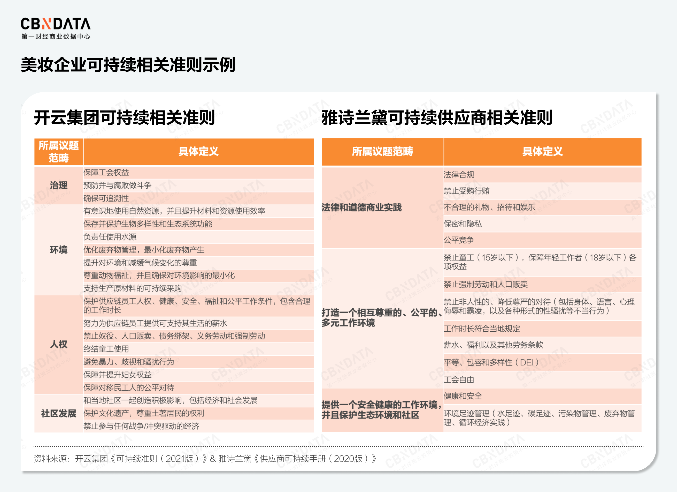 其中一个很重要的方面在于大企业可以对供应商提出更高的环境和人权要求,提高供应商准入门槛。比如开云集团的《可持续准则(2021版)》和雅诗兰黛的《供应商可持续手册(2020版)》,都对供应链企业在治理、环境、人权和社区发展多个维度的议题做出了细致的要求。