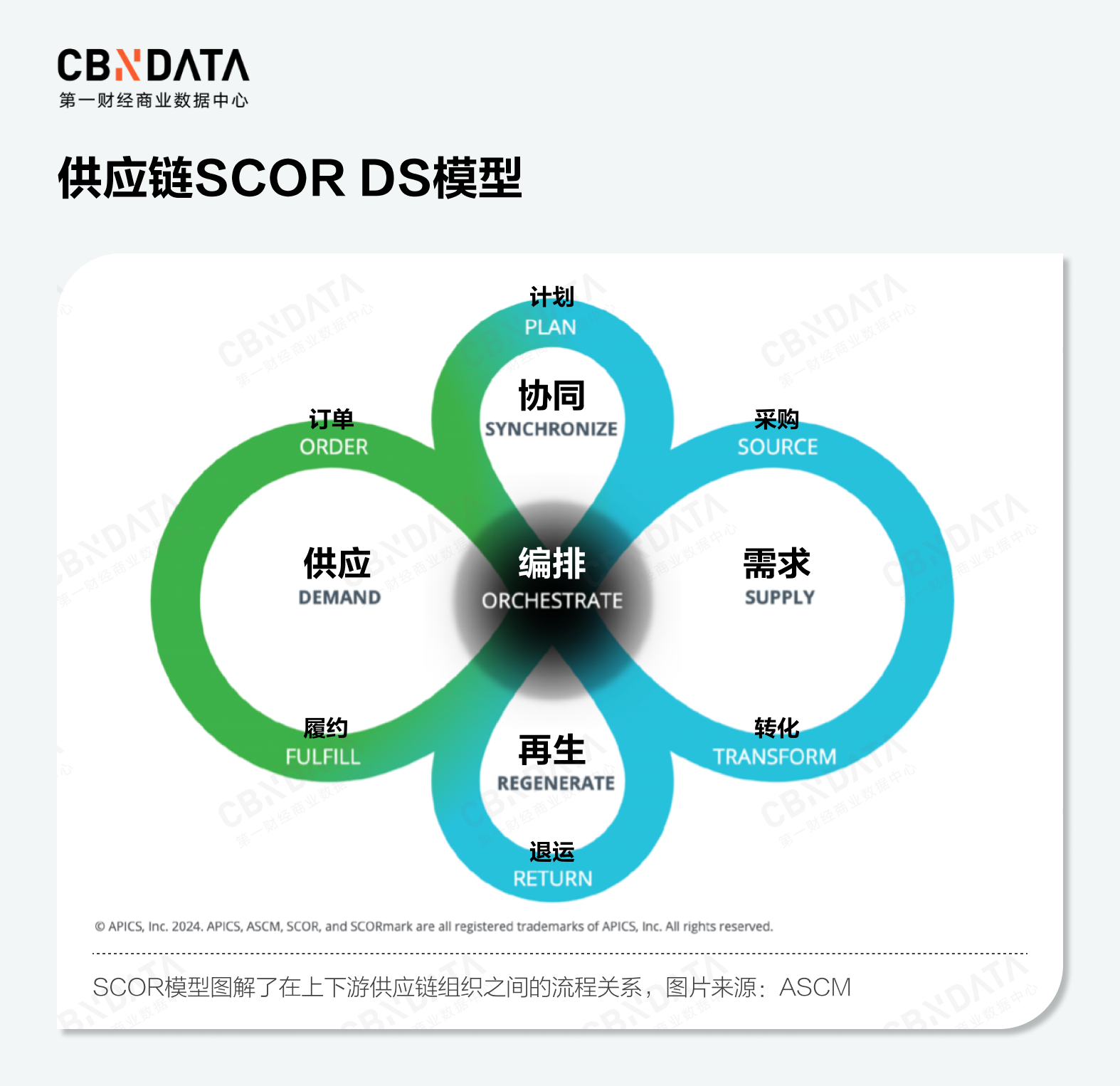 对于美妆企业而言,供应链管理并不是一个端到端的线性过程,而是一个由部分动态反馈的循环子系统构成的大循环系统。根据供应链管理协会(ASCM)最新版供应链SCOR DS模型,“供应链是一系列不断移动的活动,从流程到流程,没有人为的开始或停止”,这其中涉及到需求、供应、协同、再生四大模块,包含计划、采购、转化、订单、履约、退运六大流程,而最核心的ORCHESTRATE(编排)是整合这些模块和流程的底层环节,它直接决定了后续这些子系统以何种流程运转,又以哪些绩效指标作为标准运行。