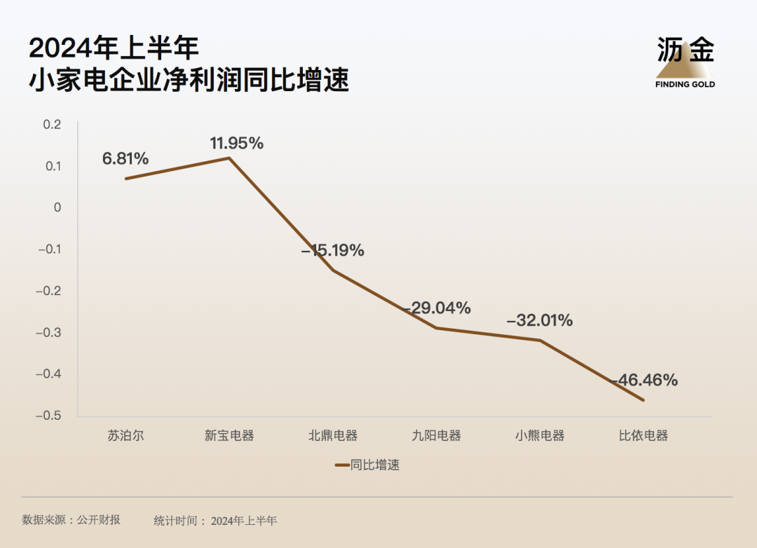 上市公司们的表现也不尽人意,除苏泊尔、新宝电器净利润小幅度增长外,均呈现明显下降趋势:北鼎电器净利润同比下降15.19%,九阳电器净利润同比下降29.04%,小熊电器净利润同比下降32.01%,比依电器净利润同比下降46.46%。