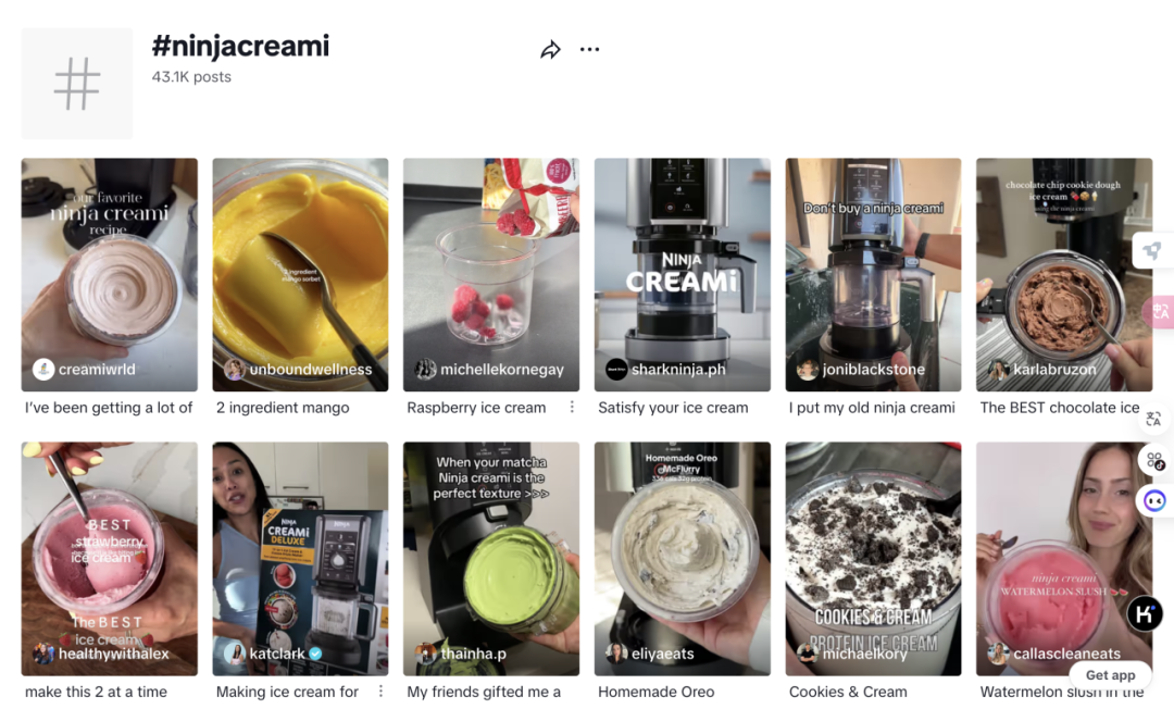 欧美区,与九阳电器同一个母公司的品牌Ninja,冰淇淋机月销稳定过万,相关话题内有4万+视频,大部分是用户的自来水式分享,部分视频点赞甚至破百万。