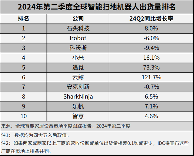 在报告中,中国品牌囊括二季度全球出货量前六名中的5个席位。除石头科技外,科沃斯、小米、追觅、云鲸均上榜,其中,科沃斯二季度出货量同比下降9.4%,小米、追觅和云鲸出货量增长率分别为16.1%、73.3%和121.7%。