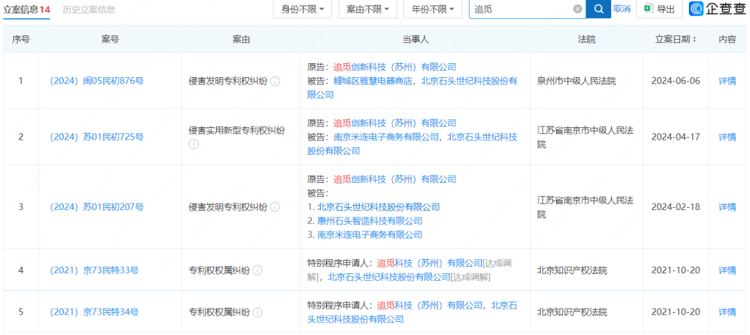 科技新知查询企查查发现,截至目前石头科技立案信息共计14条。其中,石头科技作为被告的涉及侵害专利权的纠纷共计9条,这里面追觅科技作为原告的案件5条。