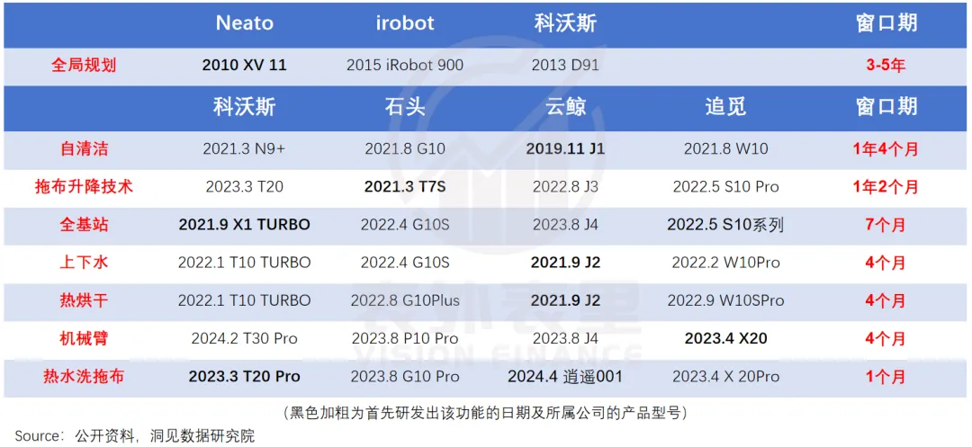 相较之下,科沃斯的微创新速度远不如“后生”们彼此“模仿”的速度。追觅跟进石头的拖布升降技术花了1年2个月,石头跟进追觅的仿生机械臂仅仅花了4个月时间。反观科沃斯,2021年的拖布升降技术,2023年才加入,率先创新的热水洗拖布也仅一个月时间便被跟进。