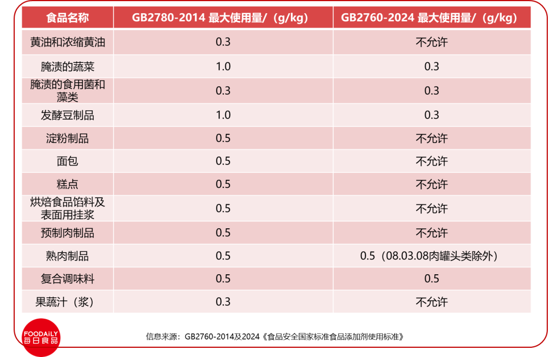 Foodaily注意到:自1998年脱氢乙酸钠被列入食品添加剂名单中以来,该成分已在国标中沿用26年。但新国标的发布,对脱氢乙酸钠使用范围和用量进行了收紧。