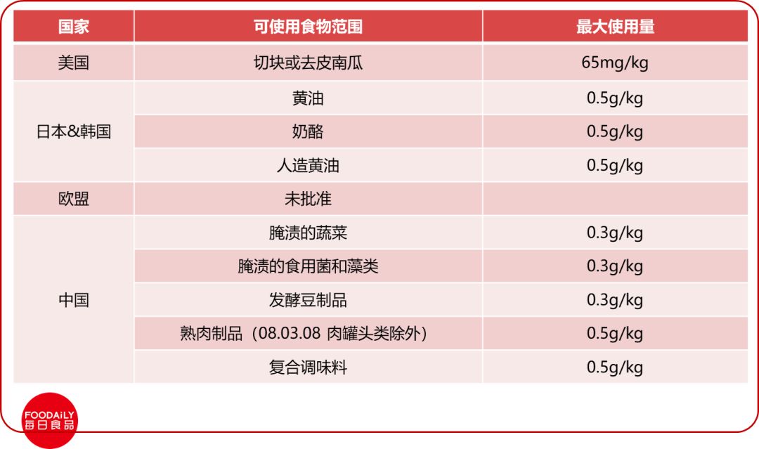 各国脱氢乙酸钠适用范围及使用量 图片来源:Foodaily自制