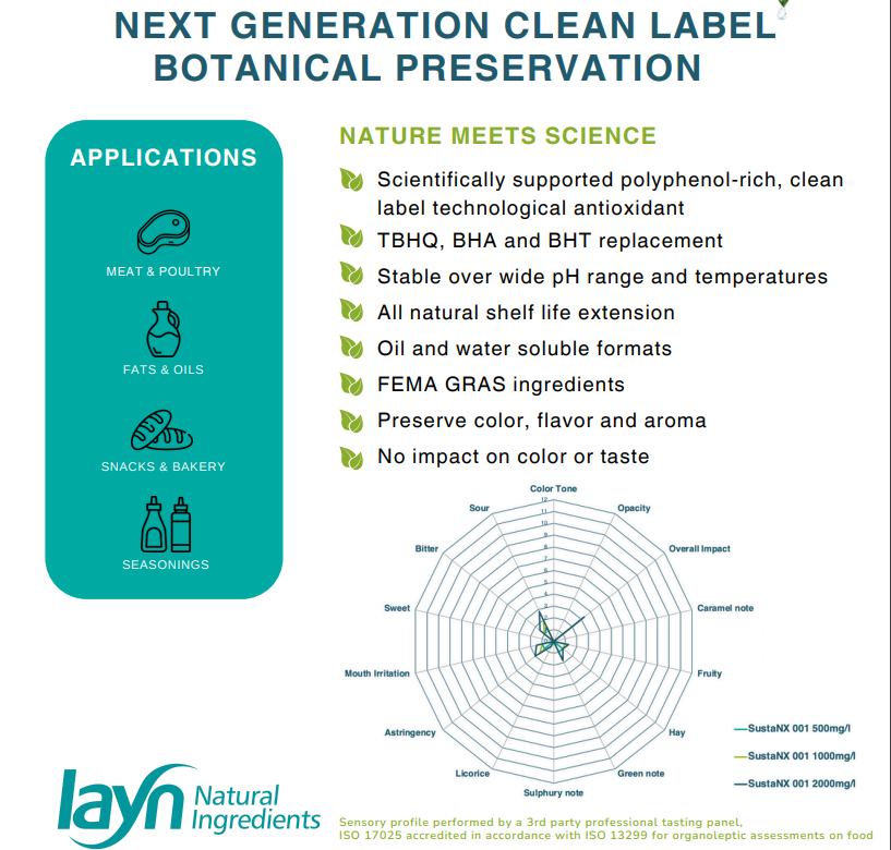 全球领先的植物性功能成分制造商莱茵生物,在2021年推出一款天然防腐剂SustaNX,富含多酚,通过结合螯合剂与自由基清除剂,成为EDTA等合成抗氧化剂的有效替代品,并具备显著的成本效益。