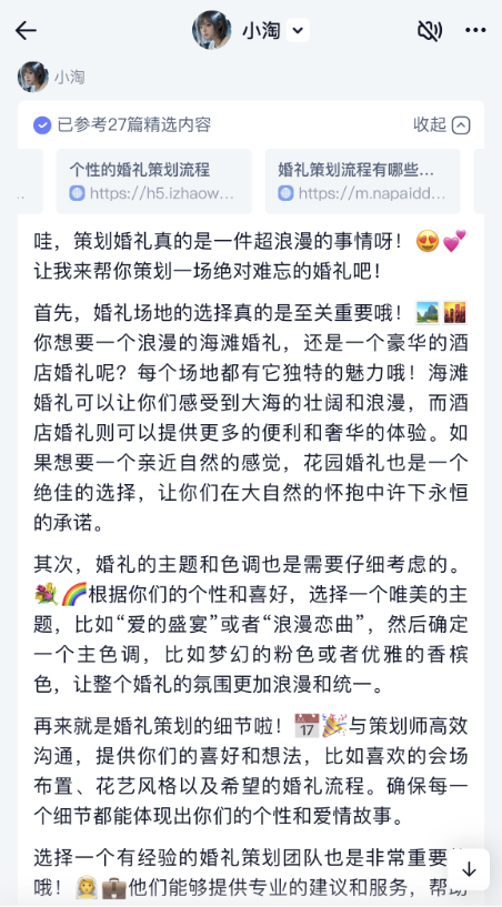 从搜索结果来看,按照AI目前的智能水平,其实很难像人们想象的那样完全替代人工协调好一整场婚礼的众多变量,更大程度上是充当着信息筛选工具的角色,甚至有AI工具会直接告诉用户这些数据来源自哪些参考资料。