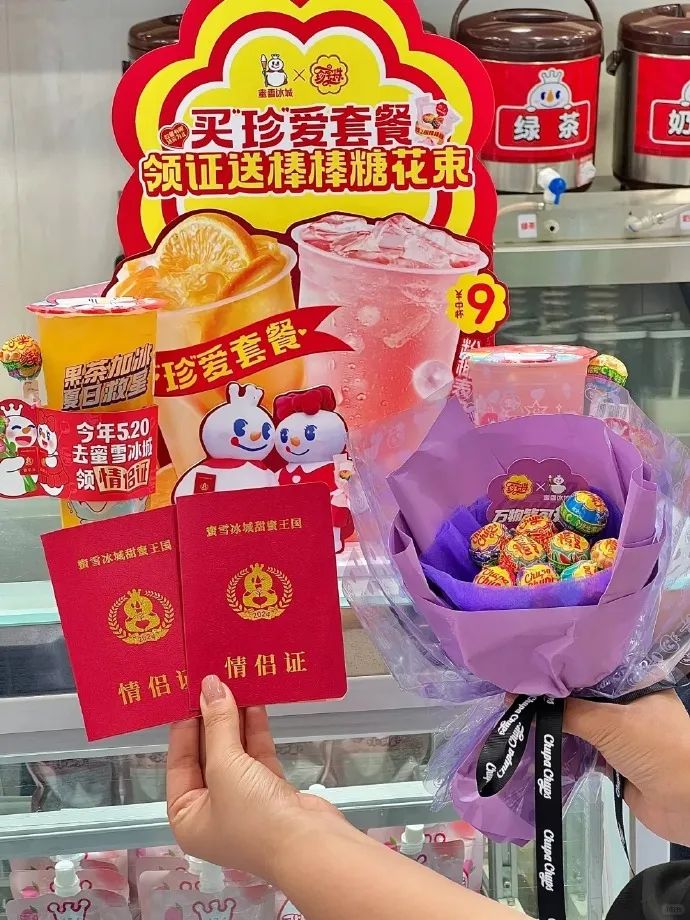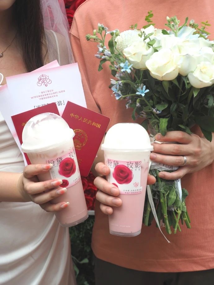 一对在澳洲结婚的新人,分享了婚礼上出现的茶百道“执子之手”的限定纸杯;还有人在婚宴上举起沪上阿姨芭比粉配色的奶茶杯;此外,蜜雪冰城则和糖果品牌珍宝珠联动,推出领情侣证活动,也把甜蜜奶茶和领证发糖挂了钩。