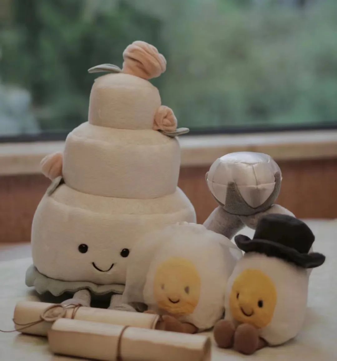 在歪歪的婚礼上,刷满存在感的还有她的jELLYCAT婚礼四件套,婚戒、结婚蛋糕和代表新郎、新娘的水煮蛋。婚礼之前,歪歪就看中了,想用它们代替传统的戒指。虽然几个小玩具加起来要花费1100元,但从价格来说,远远要比一枚真的钻戒要低,却让歪歪收获了钻戒所带不来的满足感。
