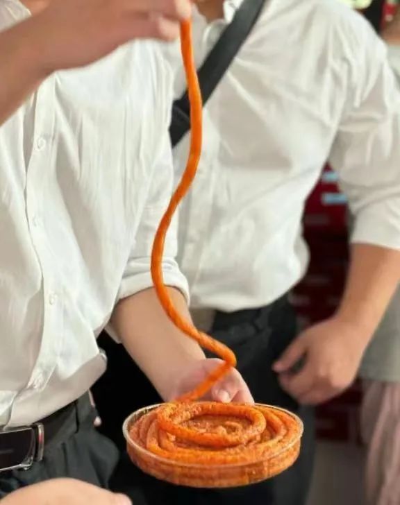 位于重庆的橘里,就收到了麻辣王子的赞助。一开始,她只是刷到了婚礼招募帖,没想到报名一个月以后,对面回复了消息。很快,她收到一大箱小包装辣条,和一袋5.20米的长辣条,后者成了接亲时最亮眼的游戏道具。