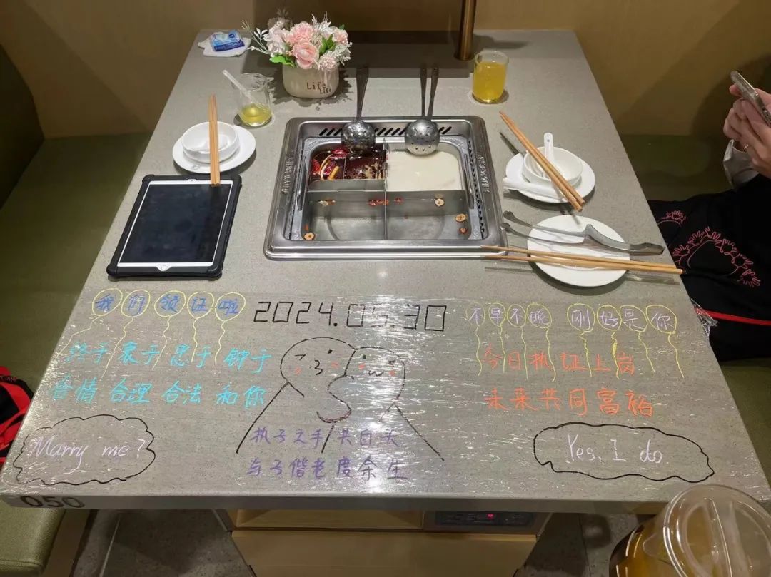 程樱本来就是海底捞黑海会员,之前过生日就去那儿“大操大办”过,她想着,结婚的日子也得热闹些,把情绪价值拉满。抱着试一试的心态,她打电话给门店预定布置,没想到对方一口答应下来。到店之后,程樱就看见桌子上用彩笔写着“我们领证啦”和一堆祝福语,架子上是写着“I Love You”的心形气球,桌面上摆着小花篮。