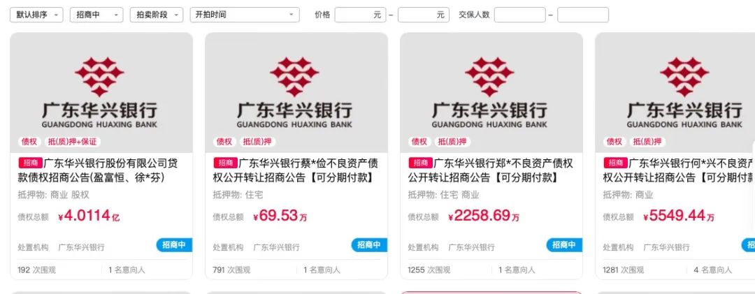 据不完全统计,当前在阿里司法拍卖平台上,处置机构显示为华兴银行,拍卖状态显示招商中的标的物还有34条。