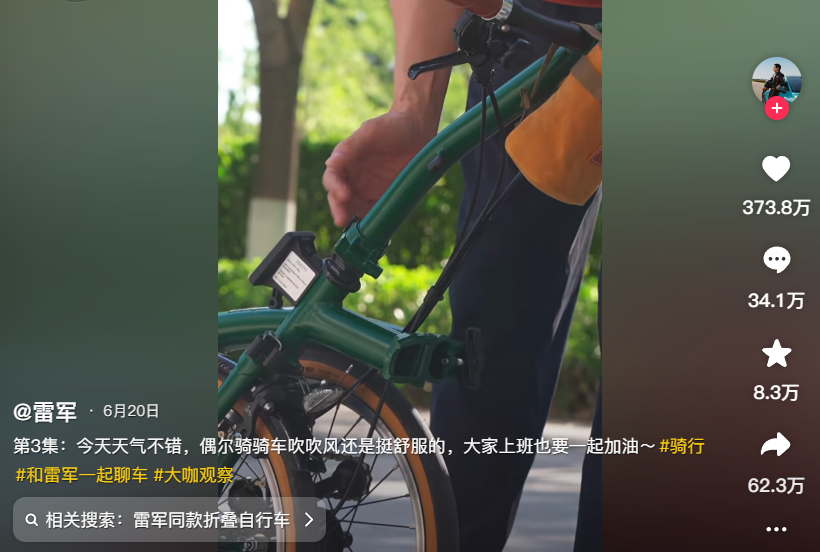 锌刻度留意到,这个合集的第一个视频发布于今年6月,名为“你们一般吃甜粽子还是咸粽子”。这条视频的点赞量达到23万,评论量多达3万余条。而此后共有7个视频的点赞量超百万。其中点赞量最高的一条视频是雷军骑了一辆便携式折叠自行车去上班。而这条视频发布后,不仅点赞量近400万,更有不少人发布视频深挖雷军同款折叠自行车。