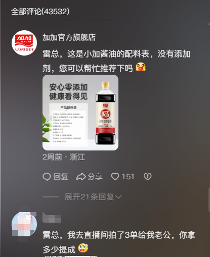 而评论区里则既有网友被种草,“凡客有没有卖行政夹克啊,想给我爸爸买几件”;也有人调侃道,“雷总也是好起来了,能接凡客的广子了”;还有品牌方找上门,其中加加酱油就留言称,“这是小加酱油的配料表,没有添加剂,您可以帮忙推荐下吗”……而在小红书上,则有不少网友建议雷军进军眼镜业、医美业,“把价格打下来”。