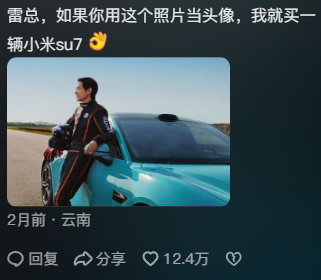 从评论区,他捕捉到粉丝的需求,比如,有网友在评论曾留言说:“雷总,如果你把我选的图片设为头像,我就买辆小米SU7!”而当雷军更换了头像,该网友便买了车“交作业”, 雷军还回复该网友称“看到了。”后来,评论区便频频有网友“玩梗”。