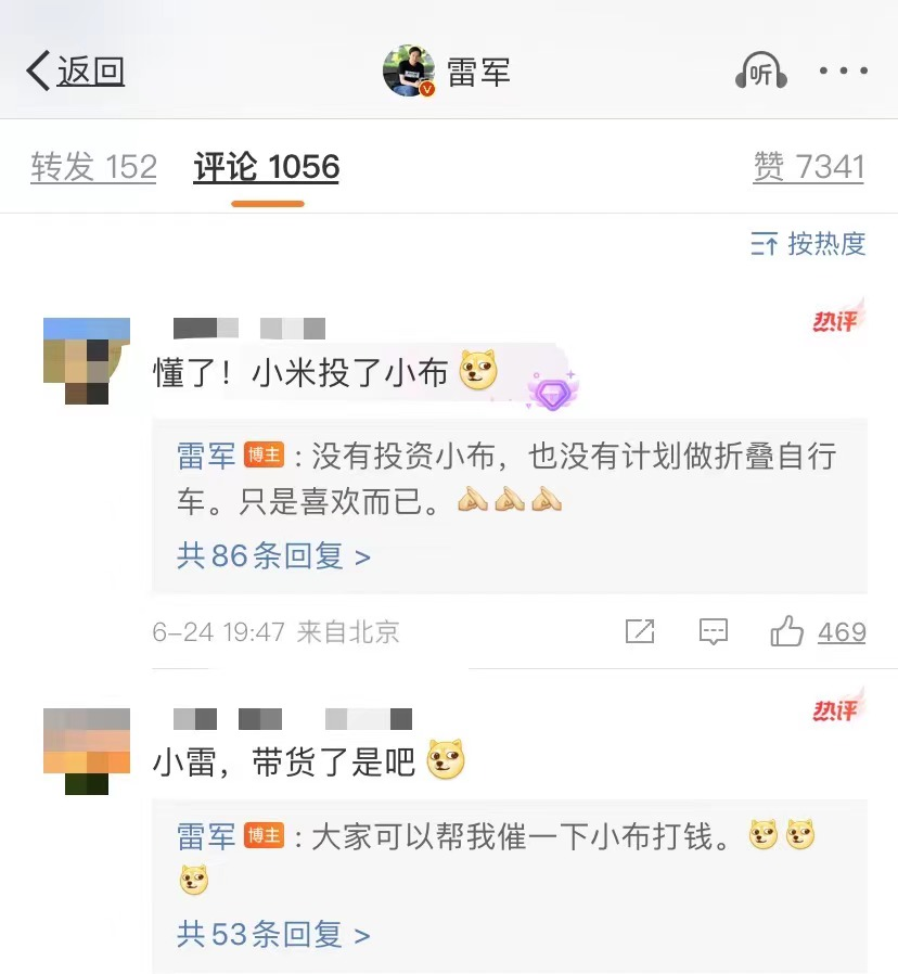 当然,雷军偶尔也断了网友们的“念想”,比如有人呼吁小米进军房地产,他立刻回绝,“这你就别想了”。粉丝们呼吁让雷军“把折叠车的价格打下来”。直到上了热搜,雷军才回应公司没有计划造自行车,更没有投资小布。