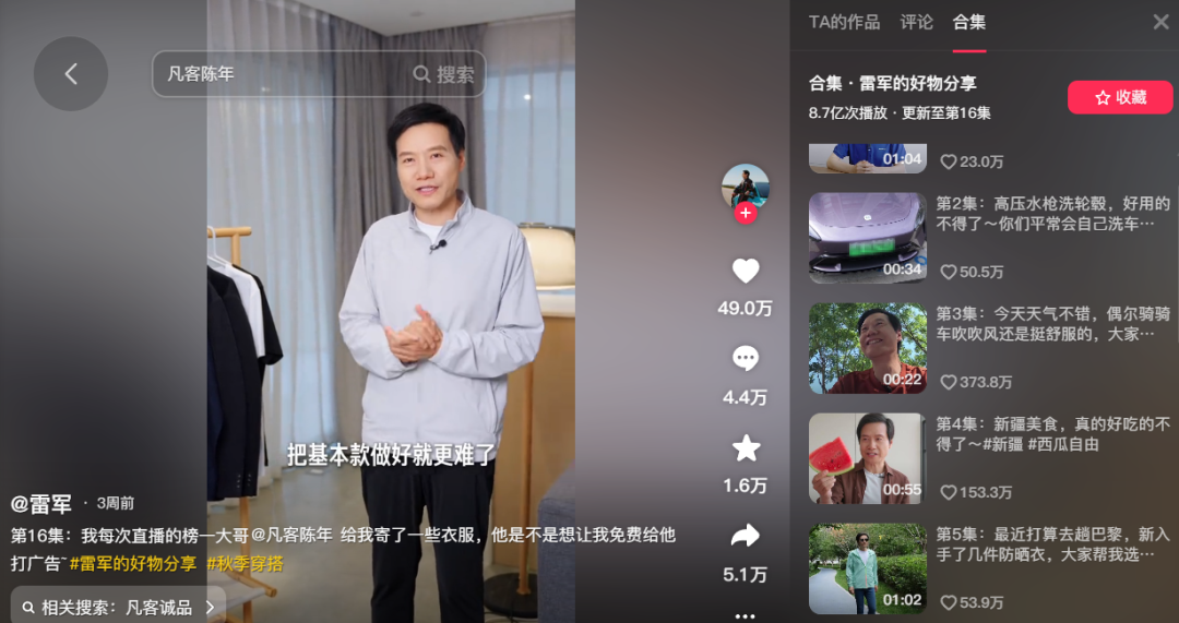而雷军的网红路虽然始于手机和汽车,却不止于此。近期,雷军带货的品类从“出差好物分享”里的防晒衣和辣椒酱,到“榜一大哥”凡客诚品创始人陈年寄来的万能套装,无一不迎来粉丝们的热捧。在抖音,“雷军的好物分享”系列已更新至16集,播放量达8.7亿。