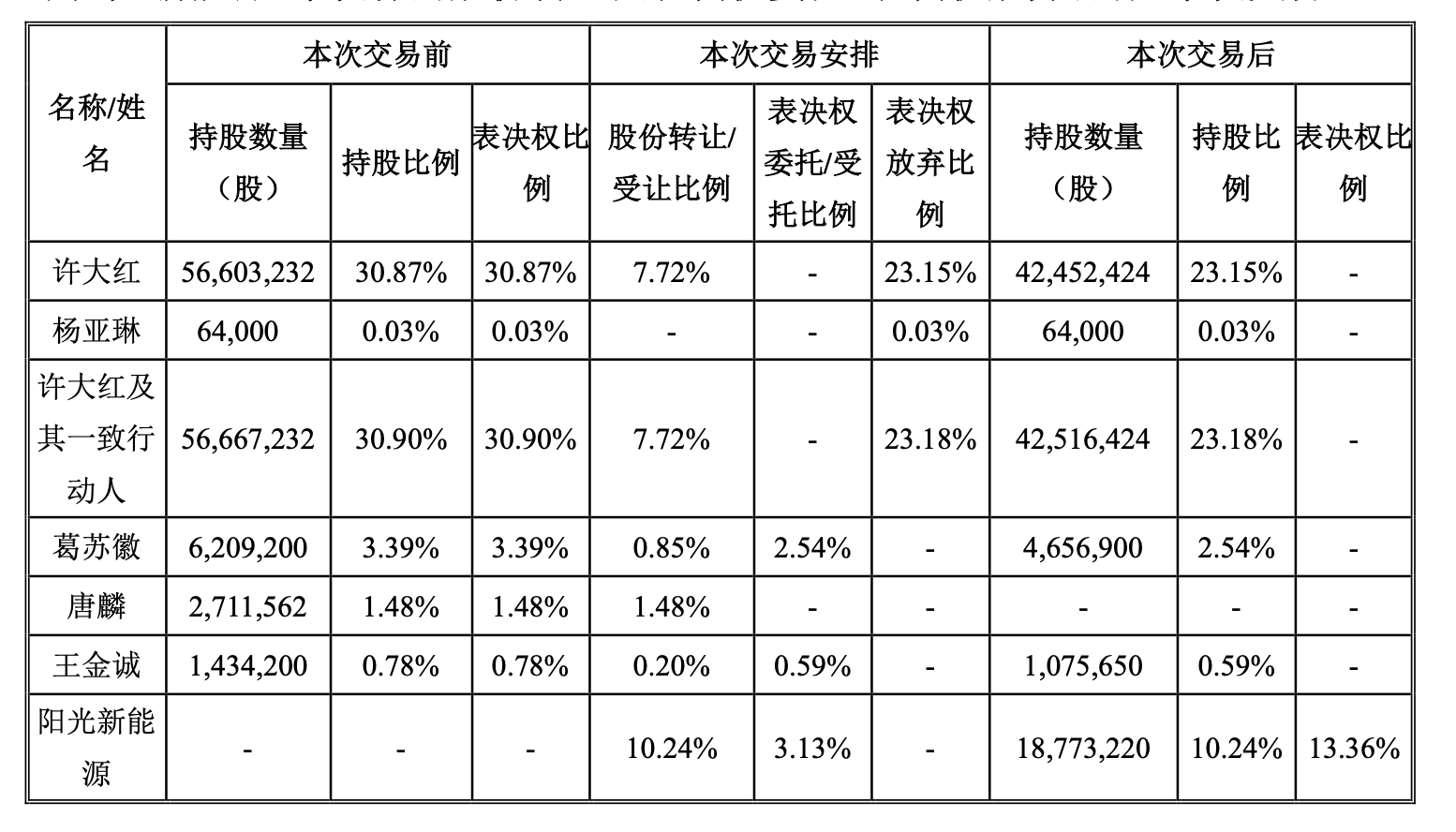 同日,阳光新能源与许大红及其一致行动人杨亚琳签署了《表决权放弃协议》;与葛苏徽、王金诚签署了《表决权委托协议》。