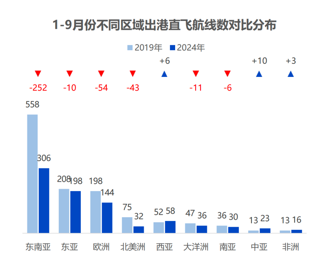 根据航班管家发布的1-9月国际航线运行情况,只有西亚、中亚、非洲三个区域的航线数已经超过2019年。欧洲航线相较于2019年减少了50多条,北美(包括美国和加拿大)航线数则不及2019年的一半,哪怕是当先航线最为密集的东南亚区域,相较于2019年也减少了两百余条航线,接近腰斩。