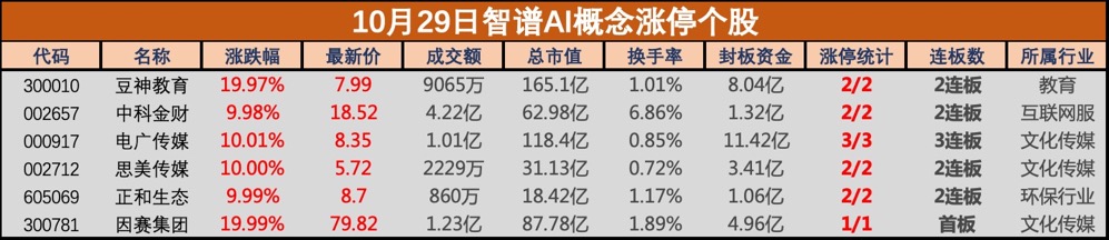 10月29日,智谱AI概念股继续大涨,因赛集团(300781)、豆神教育(300010)、思美传媒(002712)、正和生态(605069)、中科金财(002657)等涨停,首都在线(300846)、并行科技(839493)、创业黑马 (300688)等跟涨。