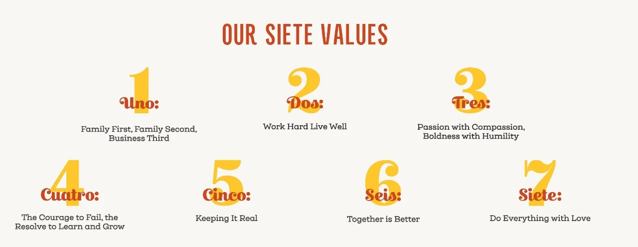 Siete Foods公司的七条价值观中,第一条为“家庭第一、家庭第二、生意第三”。
